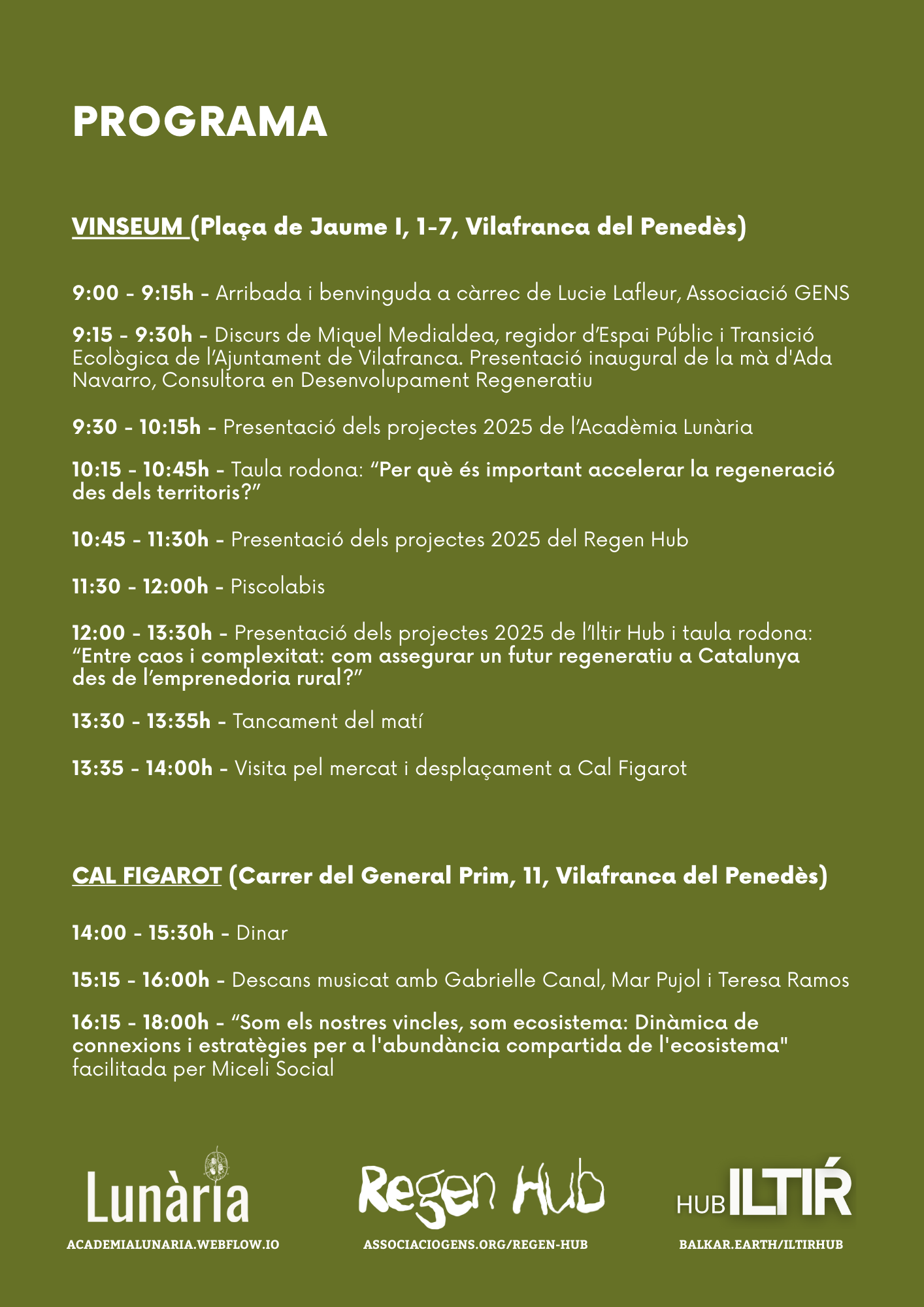 Aquesta trobada reuneix tres programes d’acceleració impulsats pel Departament d’Empresa i Treball de la Generalitat, en innovació territorial i agroalimentària —Regen Hub, Iltir Hub i Acadèmia Lunària— que, des de diferents punts del territori, impulsen iniciatives orientades a enfortir la sobirania alimentària, dinamitzar el desenvolupament rural i regenerar els ecosistemes locals.